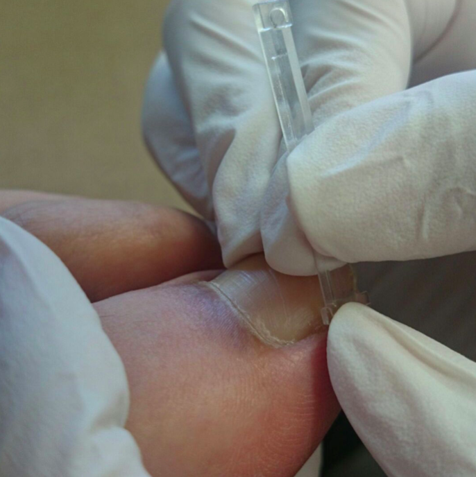 強力な補正力をもつ、特許取得のプレートを取り付けます。これによって、巻き爪が元の状態に補正されていきます。